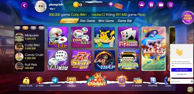 - Minigame: Tài Xỉu, Pikachu, Star Bar, Phang (chưa ra mắt), Mini Poker, Diamond, Cao thấp, Bắn Cá.